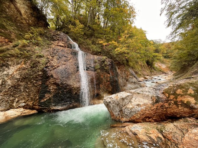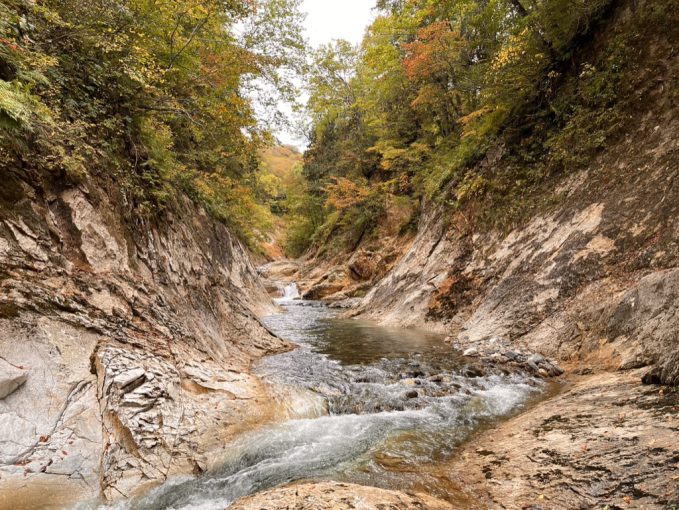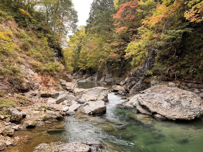 ひとくちにゴルジュといっても、当たり前だが沢によって様々だ。どれも増水したら危険というのは共通するが、葛根田のお函はV字型に開けており空間そのものが明るいこと、水に磨かれた岩肌の見事さ、水深が深いがゆえのエメラルドグリーンな水の色と、美しさが際立っている。
