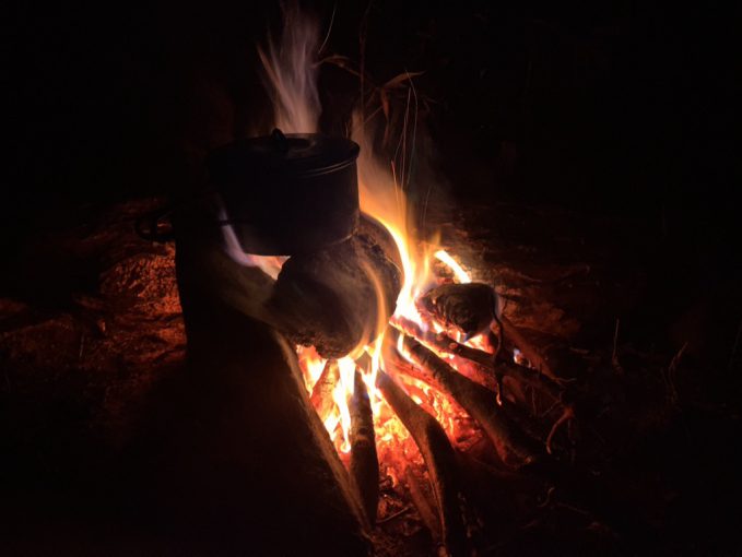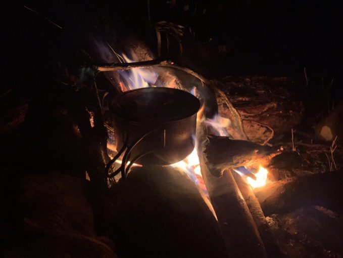 本流際に置いたケルンで水位を確認しつつ、ウイスキーをあおり、火の世話をする。その繰り返しで時がすぎていく。時折、思い出したように歌が口をこぼれる。