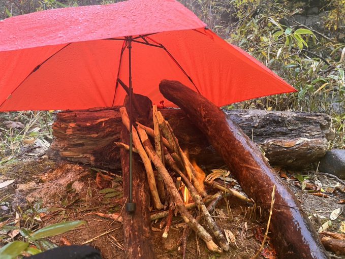 のんびりしてはいられない。薪をできるだけタープの下に入れ、ノコを挽きまくる。雨脚が強くなる。炉心の維持に努め、火勢を保つことに集中する。持参した傘を差し、火を育てる。