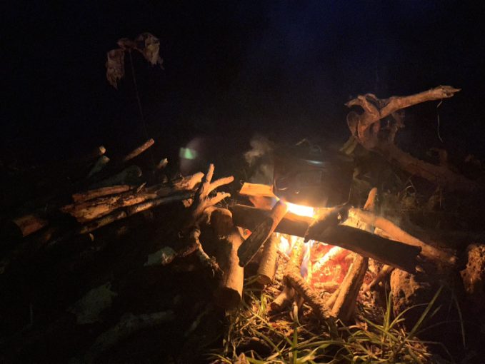 試行錯誤しつつ、コッヘルのふたで仰ぎまくり、それでも何故か火勢が弱まり消えてしまうという事態が二度ほど繰り返された。夕方となり、あたりはだんだんと暗くなる。おやおや?