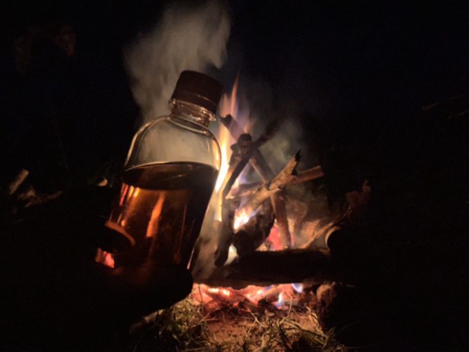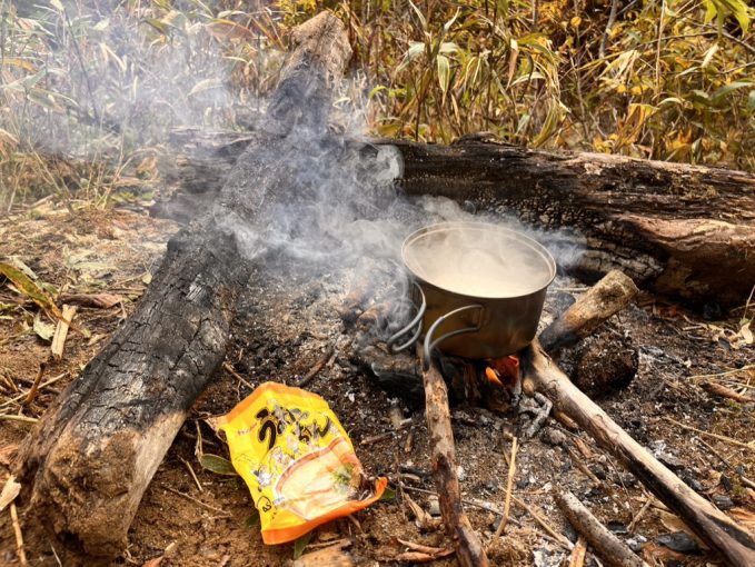 この判断が奏功し……っていうか、酒が入ったペットボトルに巻いたガムテとか、ほかにも焚き付けに使えるものはいくらでもあったんだが、どんどん暗くなっていたから焦っていたんだろうね。まあ無事に焚き火は安定し、湯が沸いた。