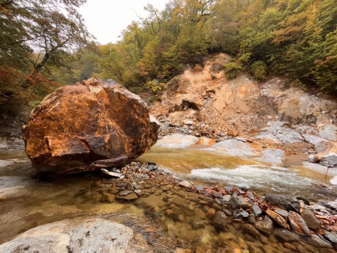 大石沢出合から中ノ又沢出合までは、ほぼ1本。歩き初めてすぐのところが崩壊しており、巨大な岩が沢中に鎮座している。
