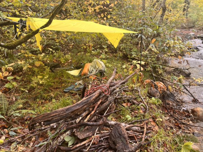 タープが決まったら、薪集めだ。昨日の反省を込めて目一杯で5往復ほど。これが真面目に堪える。戻っては肩で息をするの繰り返し。沢中の行動以上のカロリー消費を感じつつ、どうやら朝まで燃やせそうな量の薪を積み上げた。