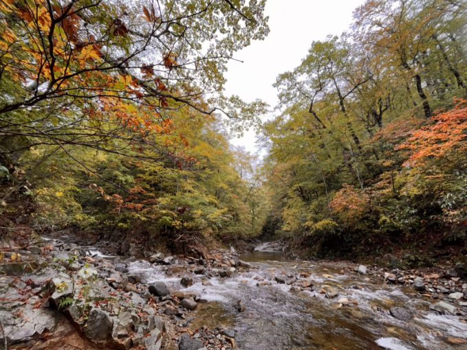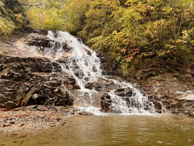 足元が悪いところは基本ない。時折現れるナメ。このあたりから頻繁にイワナが走るようになった。目元が緩む。朝イチの谷歩きをゆっくり楽しんでいると、沼ノ沢が右岸から入る。