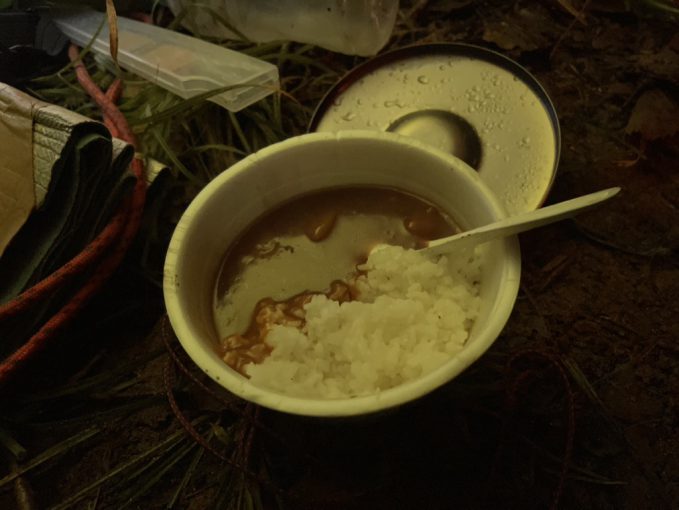 そのうち腹が空いたので、荷物を減らすべく、まずはどん兵衛に湯を注ぐ。食べながらまた湯を沸かし、こんどはアルファ米。さらにレトルトカレーを温める。どんどん荷物を軽くするぞー!