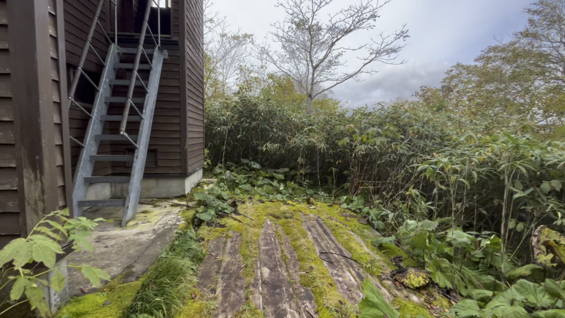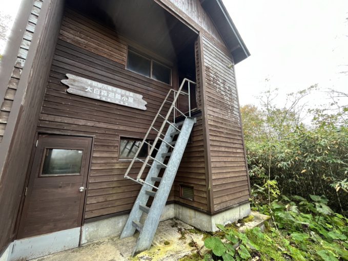 踏み跡をたどるとやがて木道となり、大白森山荘が現れた。うわー、懐かしい! 小屋外のデッキは苔むしてすっかり古びてはいるが、やった!辿り着いたよまたここに!