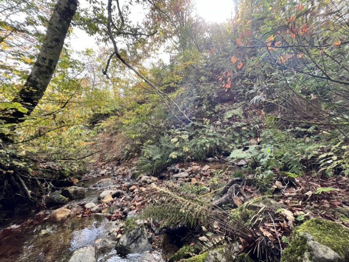 そんなエクスキューズを脳内で一瞬でまとめ、歩みを続ける。高度を稼ぐ。水量がどんどん乏しくなる。完全な源流域、水源の最初の一滴が近づいてきている。沢登りの、最高の醍醐味だ。こんなところまで来てるのに、まだ足元でイワナが走る。息は上がっているが、笑みがこぼれる。
