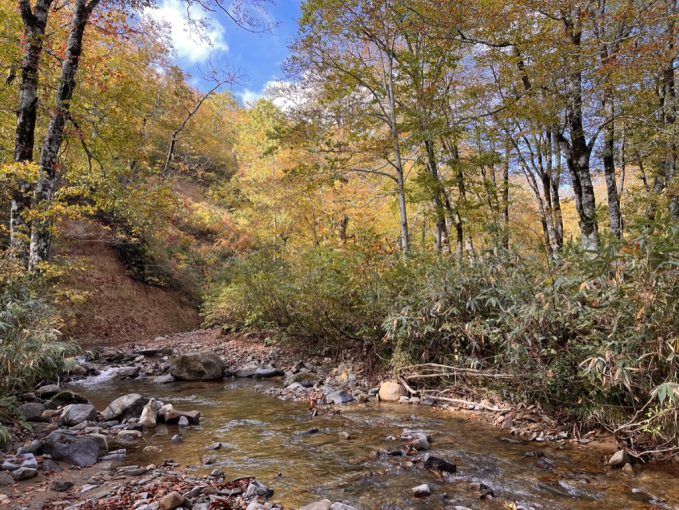 道中イワナが走りまくり、時折暖かな陽光が差してくる。グリップの効くナメ状地形が続く。