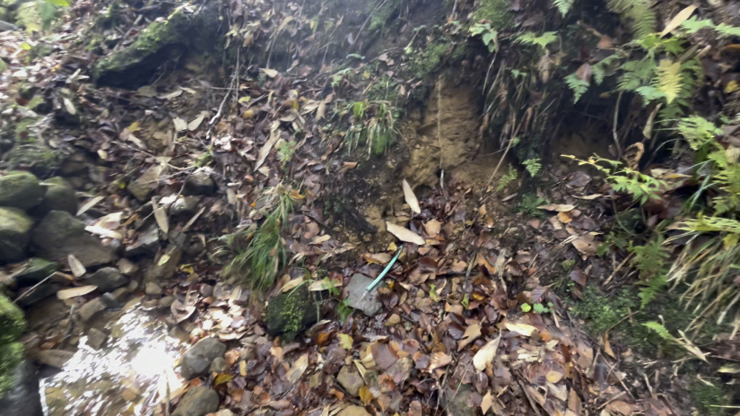やがて、赤テープが目に入り、ホースが据えられた水場に到着した。予想通り盛夏の頃の水量には程遠いが、明らかに大白森山荘の水場だ。