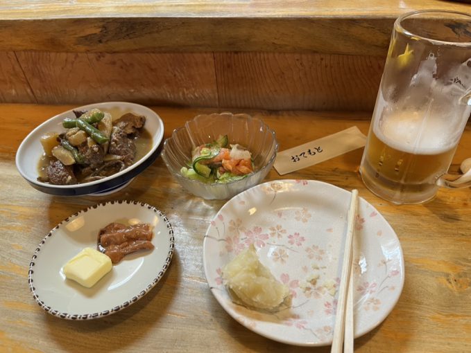 グイグイ飲んでいると、お通し的なものが三皿出てきた。するとおばあちゃんが「おにいさん、熊食べる?」と。