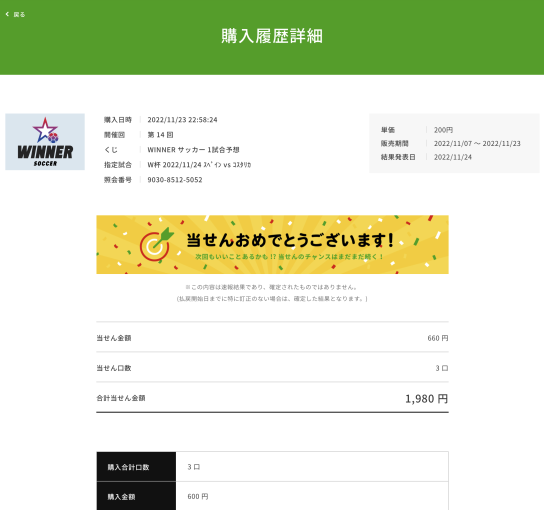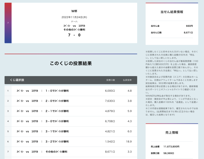 ん、1980円? そんなもんかーとやや落胆しつつ調べてみました。Winnerって透明性高くて、各選択肢の詳細とか当せん結果も細かく出してくれてるんだね。これは好感度高い。