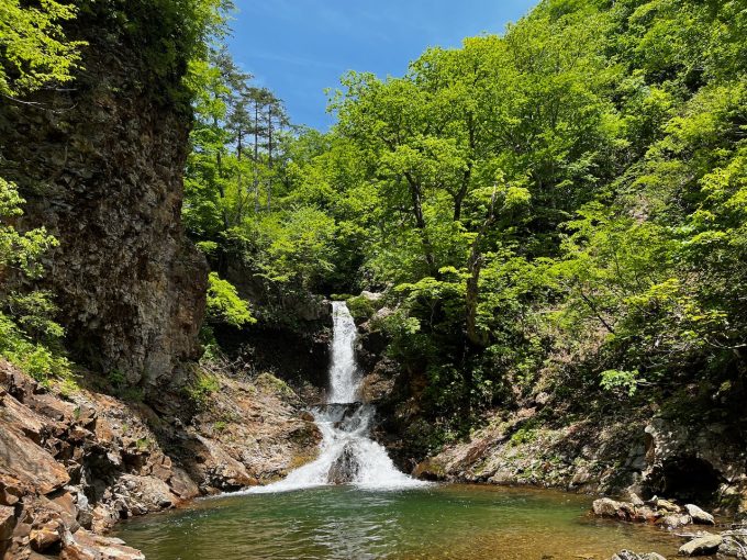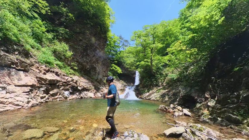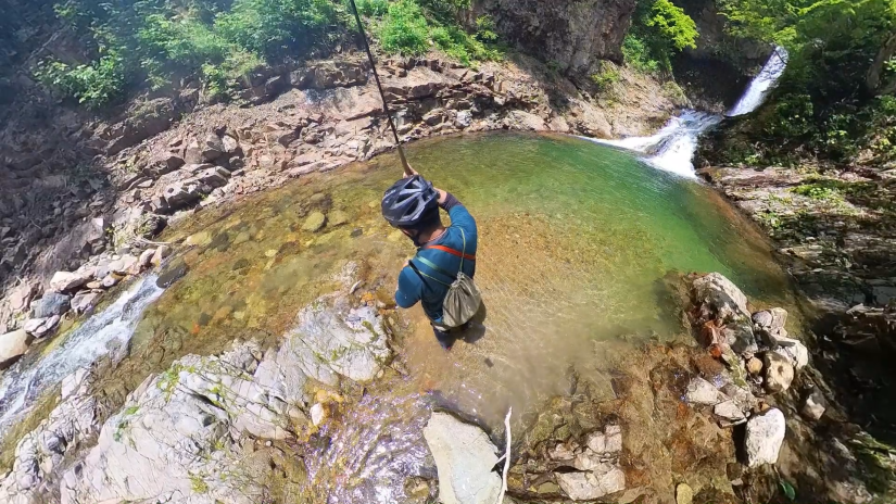大滝に到着してから下段の釜で探るも、ここでも八寸がせいぜい。小物も含めて五〜六匹釣り上げたが、すべてリリースして釣りは終了とする。