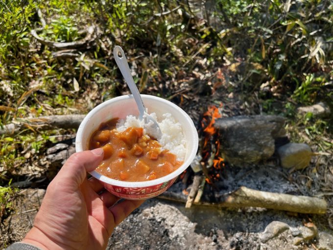 朝食は、なるべく重量を減らしたいのでアルファ米+ボンカレー。なんか、このパターン昨年からまったく進歩していない(笑)。