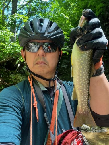 さすがに岩魚ちゃんがどんどん弱っていくので、たまに流れに沈めて、エラ呼吸をしているのを確認しながら歩く。おかげで全然進まない(笑)。