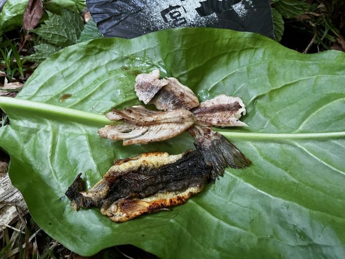 タープを張って、薪を集めて、ほとんど虫の息の尺イワナを捌く。ごめんな。