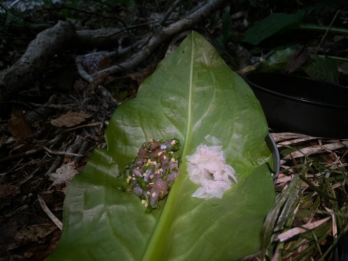 半身+アラの揚げ焼きを、やたらと生い茂っているザゼンソウっぽい大きな葉っぱの裏に乗せて頂く。味付けも同じだが、飽きない。皮せんべいもパリッと仕上がって、酒が進む。フィッシュアンドチップスのチップス抜き。美味い美味い。