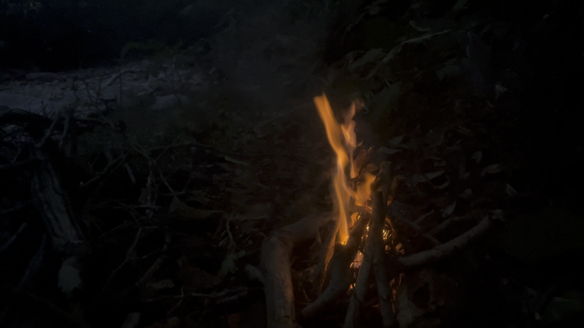焚火を熾して、まったりタイム。これまた昨日同様、薪集めのついでにもぎってきたタケノコを放り込む。味噌とか持ってきたけど、なんにも付けなくても風味があって充分に美味しい。
