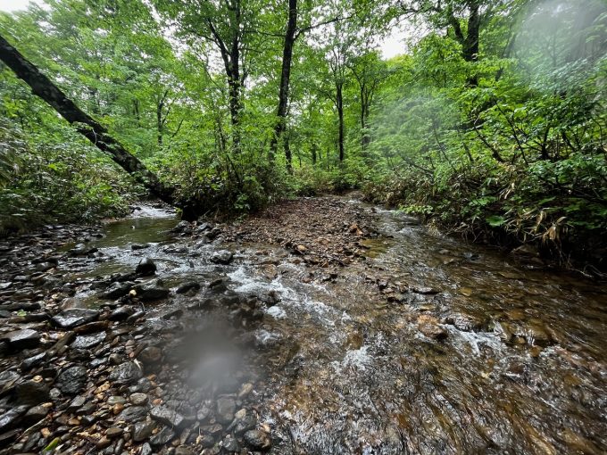30分ほどで奥の三又。昨年もそうだったがつい本流に入りたくなってしまうが、正解は手前の左から流れ込んでくる枝沢。この周辺、幕場になるかと言われると正直微妙なところなんだよね。