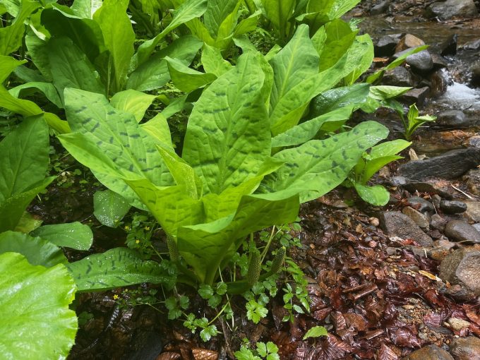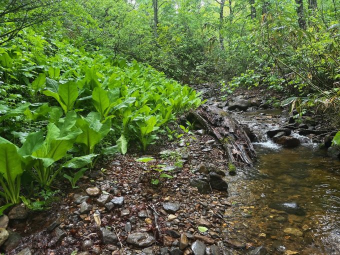 それにしても、この季節は初めてだけど盛夏とは植生がまるっきり違っていて面白い。ザゼンソウというかミズバショウというか、それ系の大きな葉の植物がやたらと多く、ワサワサしてる。なんていうか、植物が、葉が皆フレッシュなのですね。