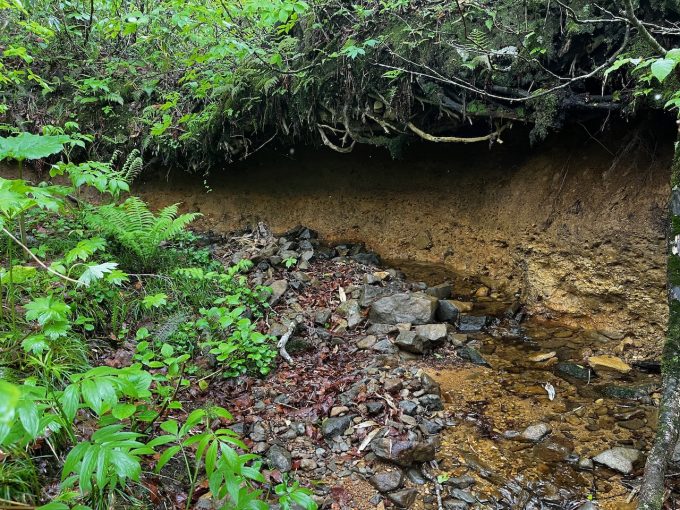 水場筋に入ると、特徴的な、土壁をえぐったような地形が出てくる。うーん、流れ自体は細いけど、これは水流が削ったのだろうか。