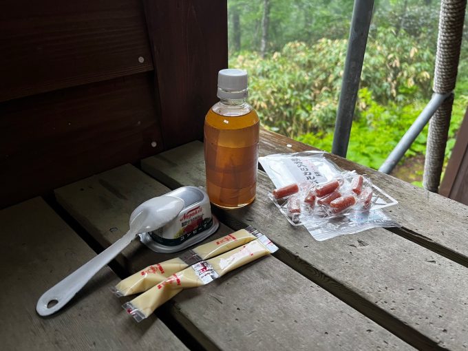 小屋に戻り、本格的に装備を干す。といっても湿度は体感でも100%近いので朝まで干して乾くかどうか。ツェルトは最初、外の階段に広げたが、雨がかかるので小屋内に入れる。もし人が来たらと思うとアレだが、そのときはそのときだ。銀マットも含め、ざっとすべての装備を広げて物干しロープを完全に専有する。