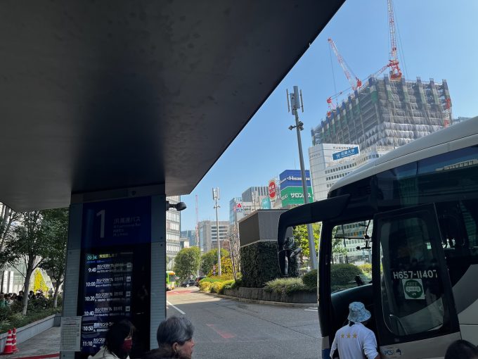 8時に自宅を出て、東京駅には9時すぎに到着。八重洲口のバス乗り場に行くと、すでに長蛇の列ができている。バスは10分〜20分間隔で出ており、この時間帯は20分刻みのようだった。9:20便には乗れなかったが、その次の9:40便には潜り込めた。交通系ICで1750円とか、そんな感じ。