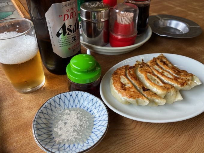まあいいかとテーブルの端に座りメニューを眺める。やがておばあちゃんが「何にしましょ?」とおしぼり持ってきてくれた。安心。レバ炒めと餃子、それに瓶ビール(大瓶なのがよき)を注文。