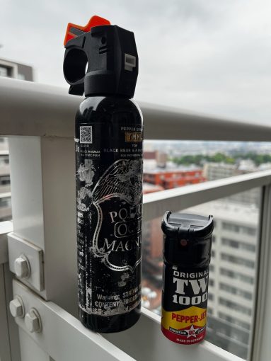 これまでは500グラム以上ある大型のスプレーを持って行っていたが、ドイツのペッパーマンというものに更新。50グラムと、10分の1に重量を抑えることができた。
