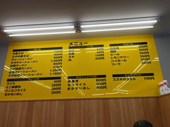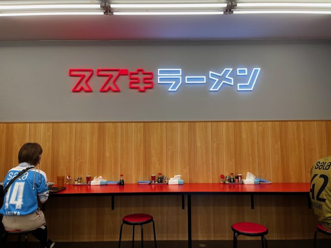 で、スタジアムへと向かう人の流れからちょっと外れて少し歩いたところに、忽然と現れる「スズキラーメン」の文字。まあ、シャレなんだろうけどヤマ発の斜向かいにあって、ロゴタイプもそれっぽい感じで寄せてきている。クレーム回避のためか、ビミョーに崩しているところも微笑ましい。
