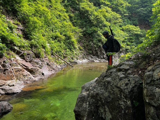 こっからは釣りモード全開。2人ともテンカラ竿を手に遡行する。Kちゃんの竿は、和竿だけあって雰囲気が佳い。綺麗なもんだ。