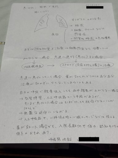 結果としては、抗生物質は効き目がイマイチだったものの、ステロイドがそれなりに効いたようで数週間で退院できる目処が立ったようだ。