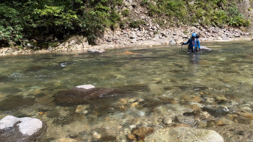 何回か渡渉しているときに思ったのだが、大雨の後だけに水量が平水時に比べて明らかに多い。10〜15cmくらい水位が高いのではないかと感じる。この水量の多さにはこの後も手を焼くことになるのだが、この時点ではわかっていない。