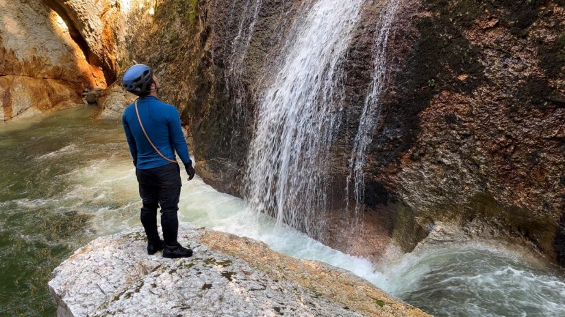 水量は多いものの、急な増水さえなければ基本的には危ないところは(強いて言えば)1箇所のみ。右岸で2番目に乗っ越すところの下りだ。先に降りて手本を示すものの、初めてだとけっこう怖いのはよくわかる。下からホールドなどの指示をしつつ、最悪落ちても受け止める前提で構えるが、Mくんどうにか無事にこなしてくれた。