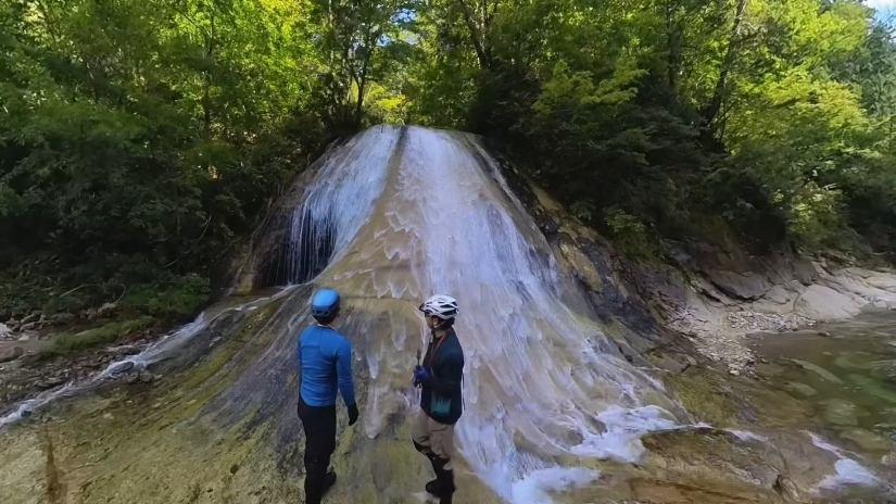 難所を越えたら、あとは観光みたいなものだ。お函特有の景観にMくんも歓声を上げている。スダレ状の滝が右岸から入る核心部で休憩。