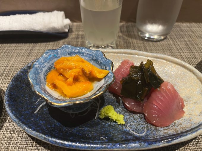 さらにはカツオも供されたんだけど、こちとら静岡県民。カツオにはちょいとうるさいよと思いつつ、よくよく見ると不思議な食材が乗っている。