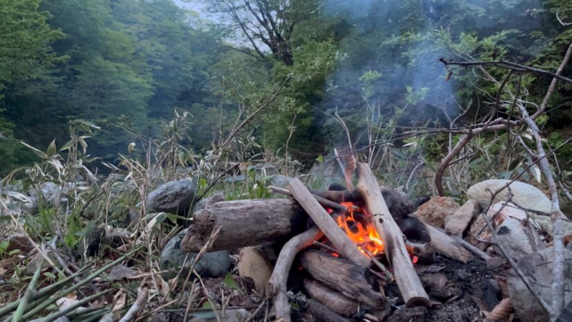 まだ日は高いが、とりあえずタープを張り、薪を集めてタケノコを採取。