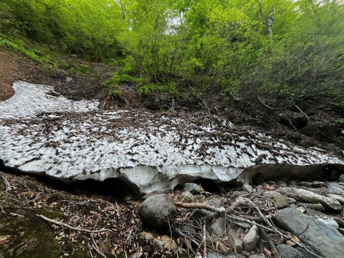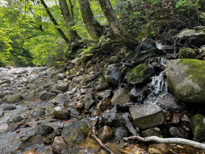ジャブジャブと、スローペースで歩いていると右岸にいつもの枝沢。荷を下ろして体調セルフチェックしつつ、ペットボトルに水を汲む。毎度のことだが、冷たくて美味い。
