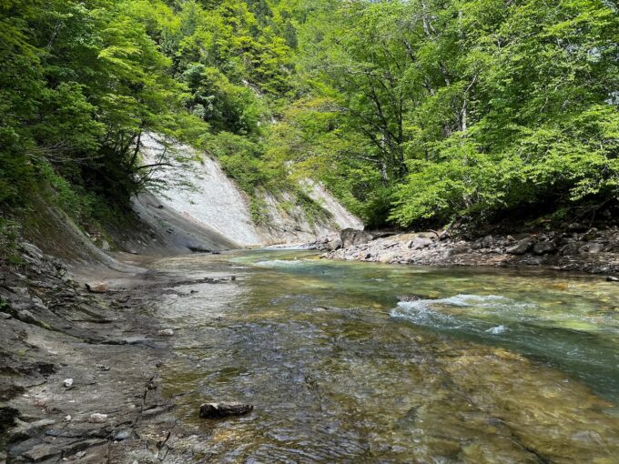 その先の、右岸のスラブ地形はついつい右岸通しで歩いてしまうんだよな。ここは、本当は手前で左岸に渡渉しておくとそのあとが楽なんだけど、必ず後で気が付く。