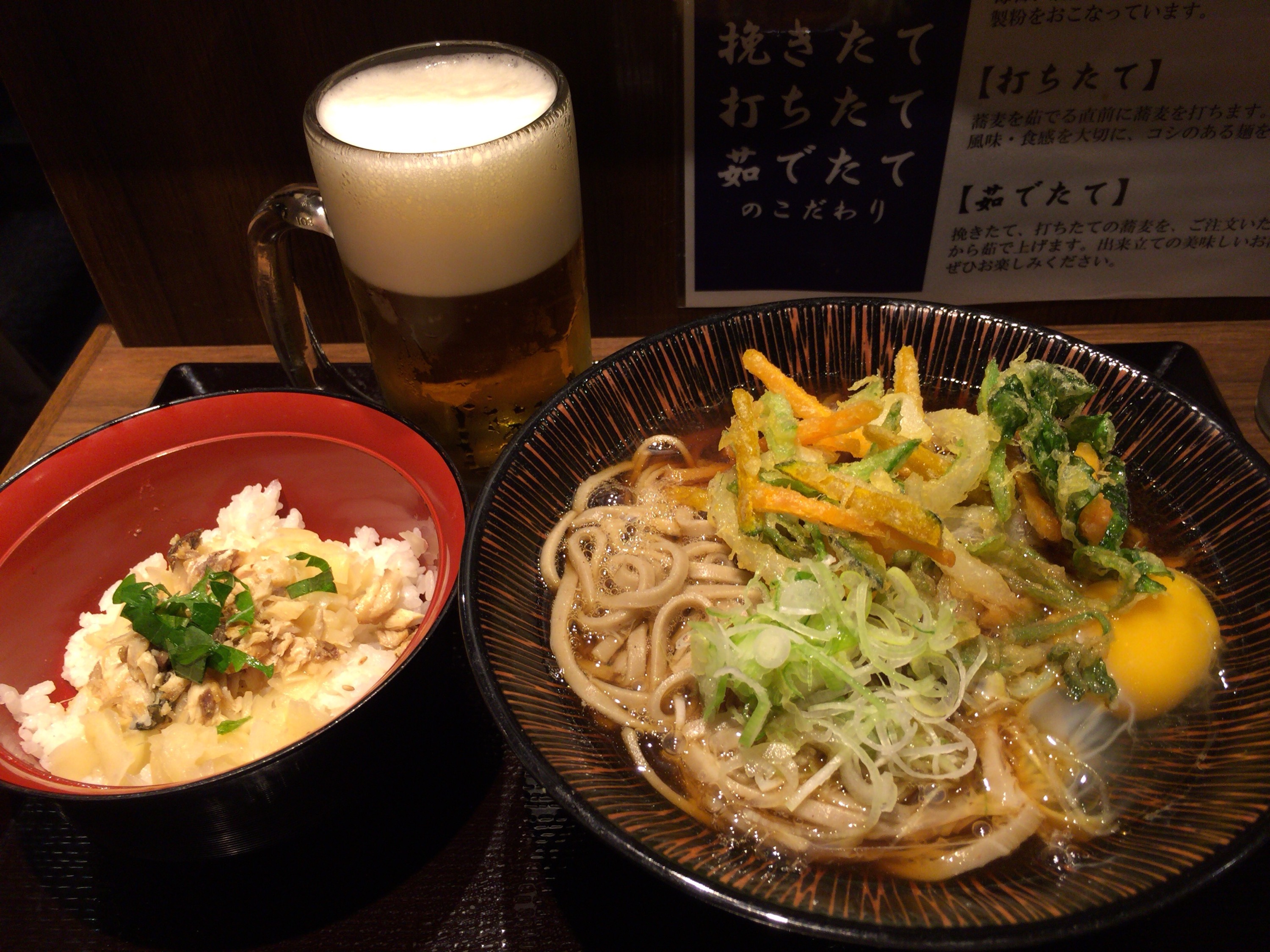 店内で蕎麦粉を引いてる。その割にはリーズナブル。ていうか安すぎる。生ビール一杯150円ってのも、大丈夫かと心配しちゃうほど(プレモルなのに)。ちなみに蕎麦は、もり/かけが330円。二枚もりが480円。私が頼んだ天玉蕎麦も480円。季節限定で鯖ガリごはん(ミニ)も追加してみた。