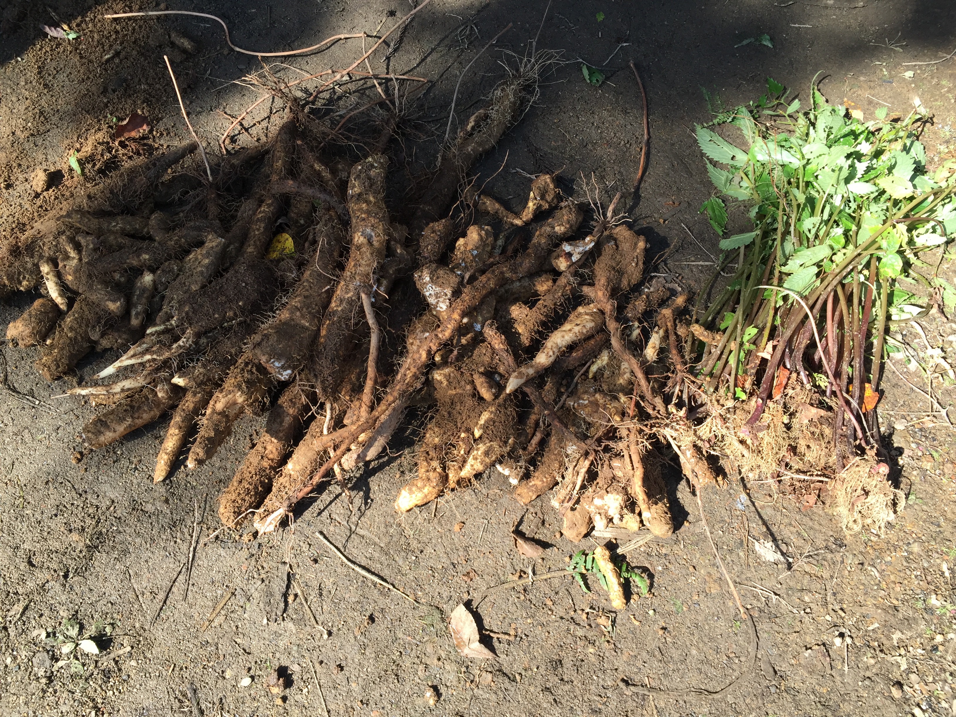 翌日。帰りもあるので時間はそうそう取れないなか、サトーさんが目星をつけておいてくれたエリアに移動すると、果たしてそこは自然薯天国であった。土も柔らかで、大きな石もほとんどない。ガーッと2時間近く掘りまくって、どうにか形にはなった。ついでに沢筋でミズを発見。季節はずれではあるが、適当に摘んでベースに戻る。
